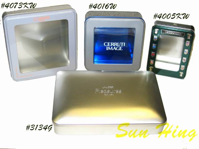 | #4005KW | Rectangular Tin Box with PVC windows and embossed on lid. 70 X 31 X 58mm | ||||